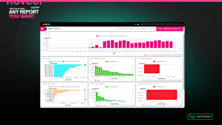 Roveel empowers SMEs and Accountants with the accessible and accurate dashboards they need to analyse their Sage 50 and Sage Accounting data. No need for numerous clunky spreadsheets, Roveel's dashboards extract and transform your Sage data from across your business. From Sales and Credit Control to the Profit and Loss and Cash, have instant visibility over your business performance.